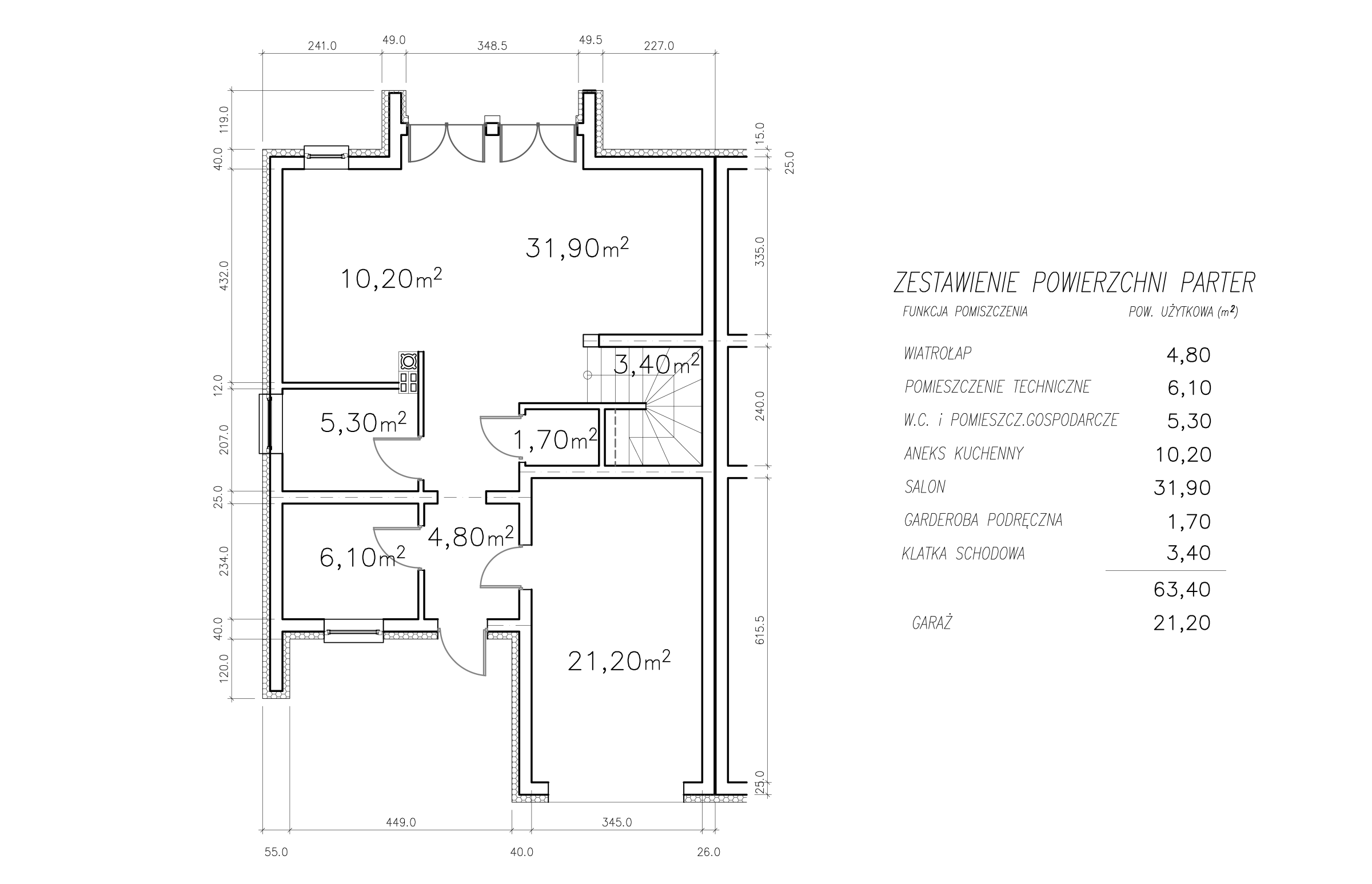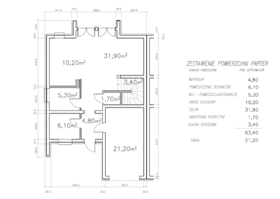 Strefę dzienną na parterze tworzy salon z kominkiem i otwartą kuchnią oraz łazienką, a w części gospodarczej jest garaż i kotłownia.