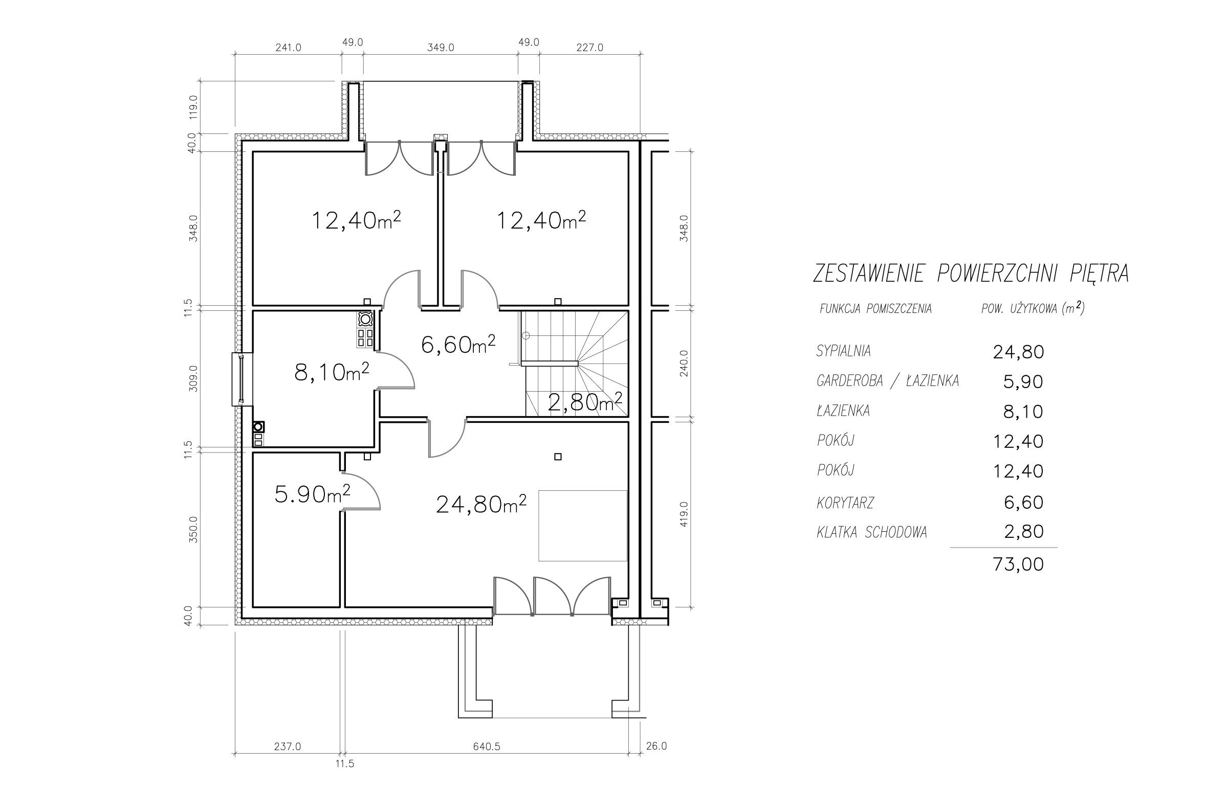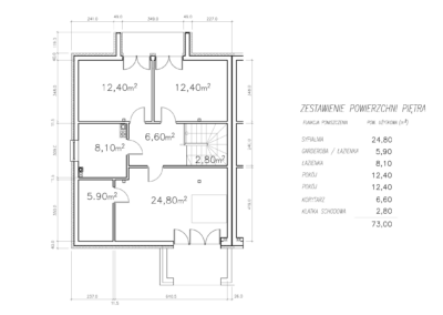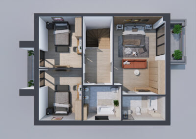Na piętrze zaprojektowano dwie przestronne sypialnie z balkonami i ogólnodostępną łazienką oraz dużą sypialnię główną z tarasem i osobną łazienką oraz garderobą.